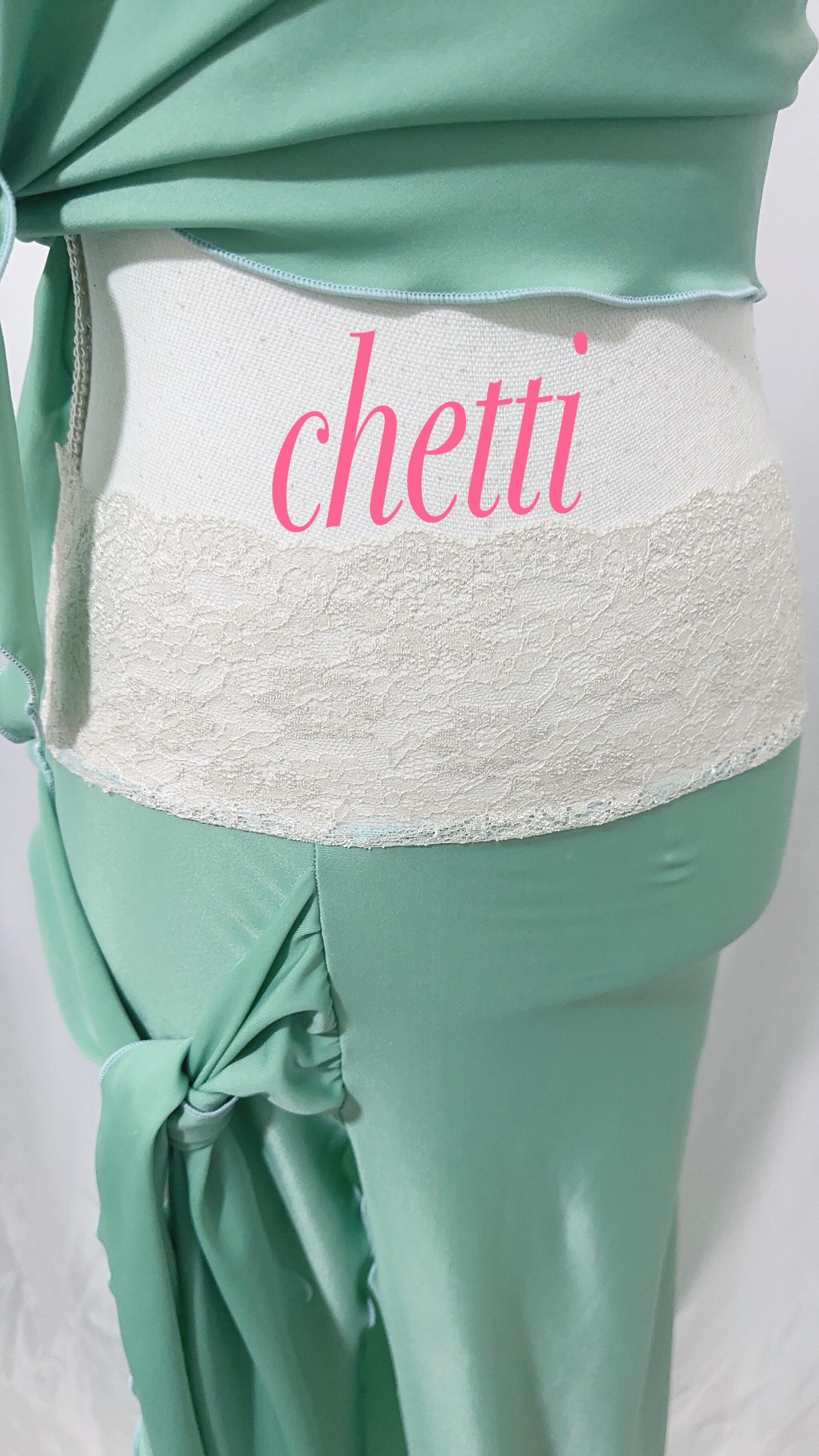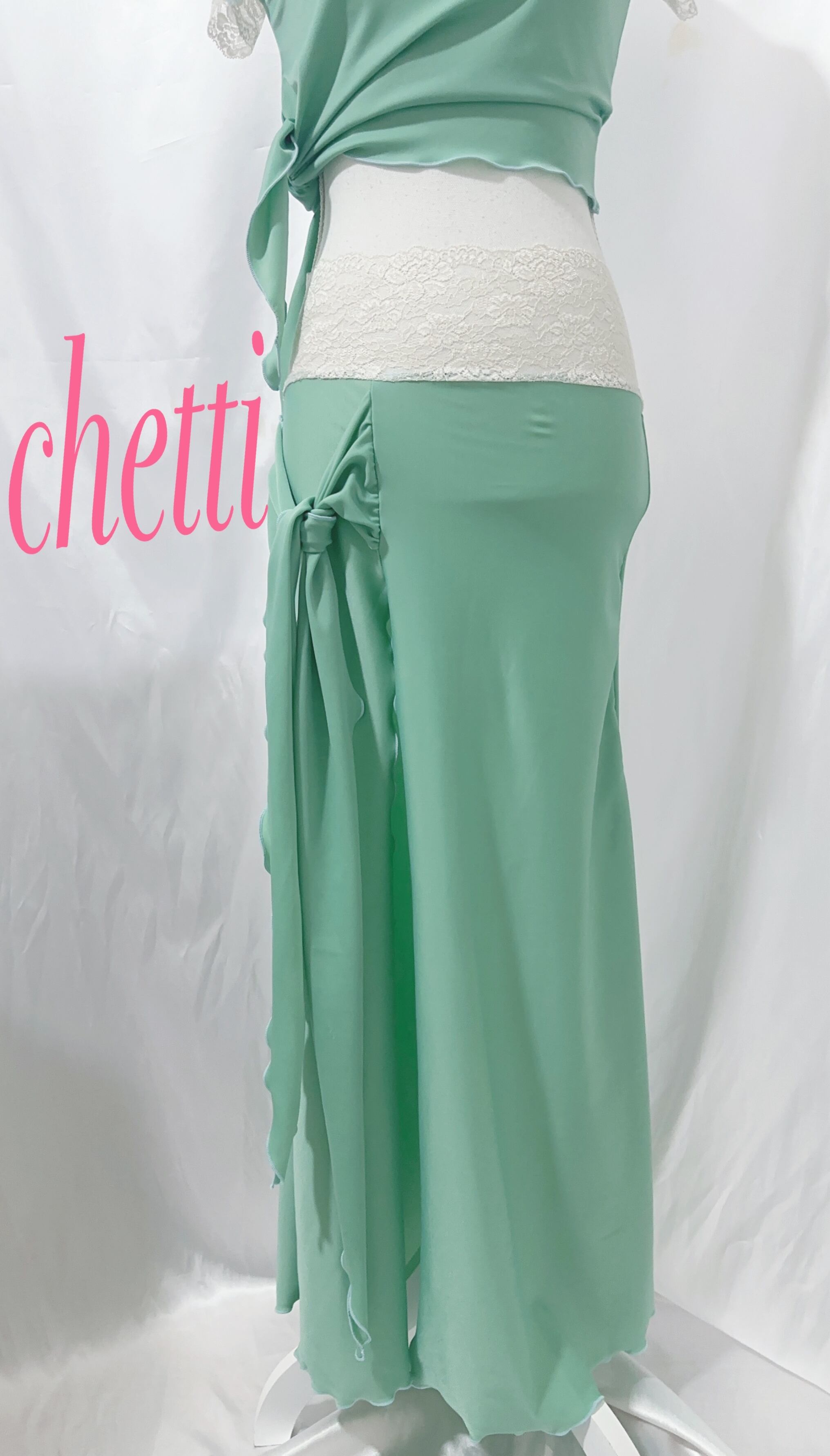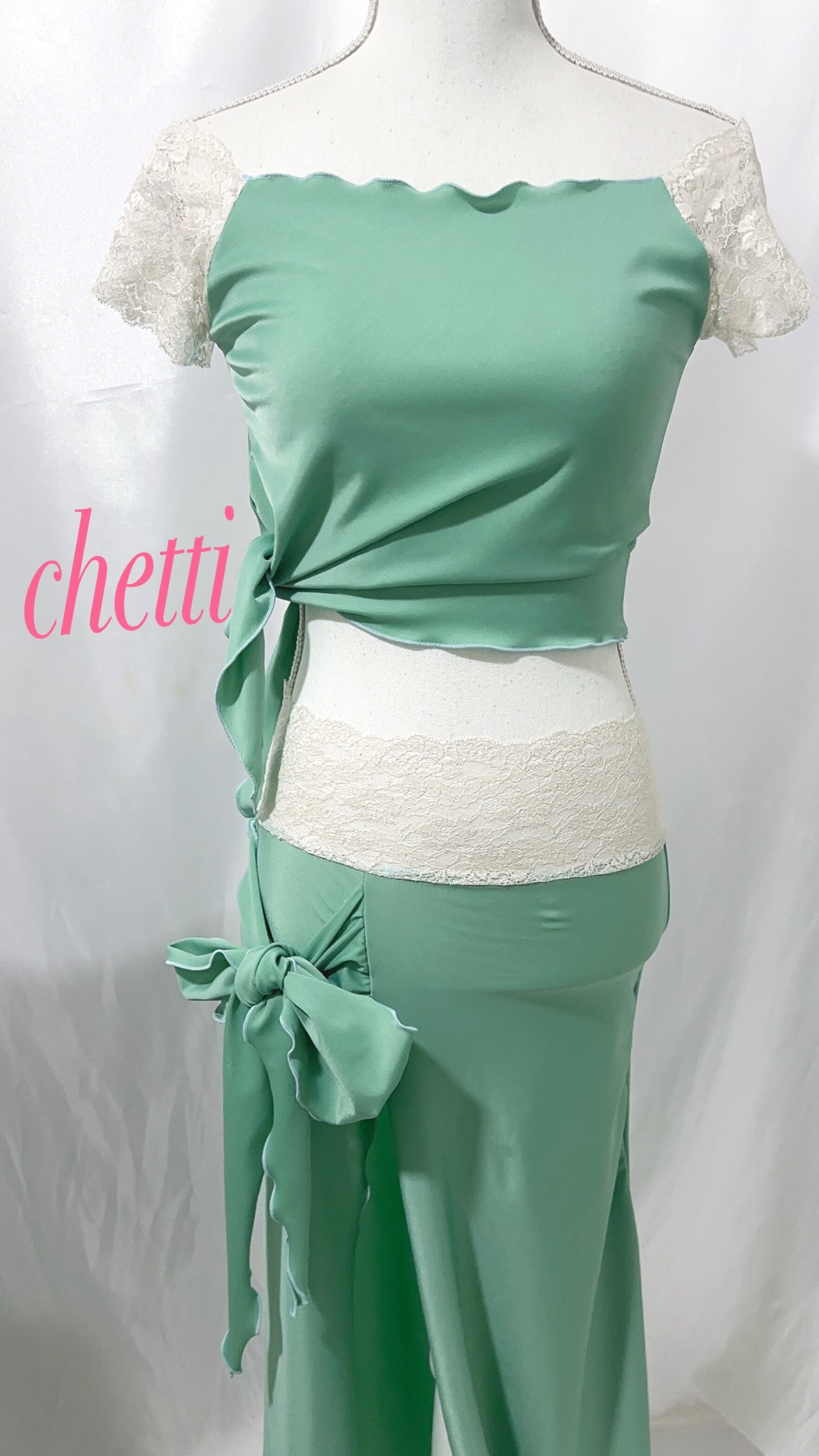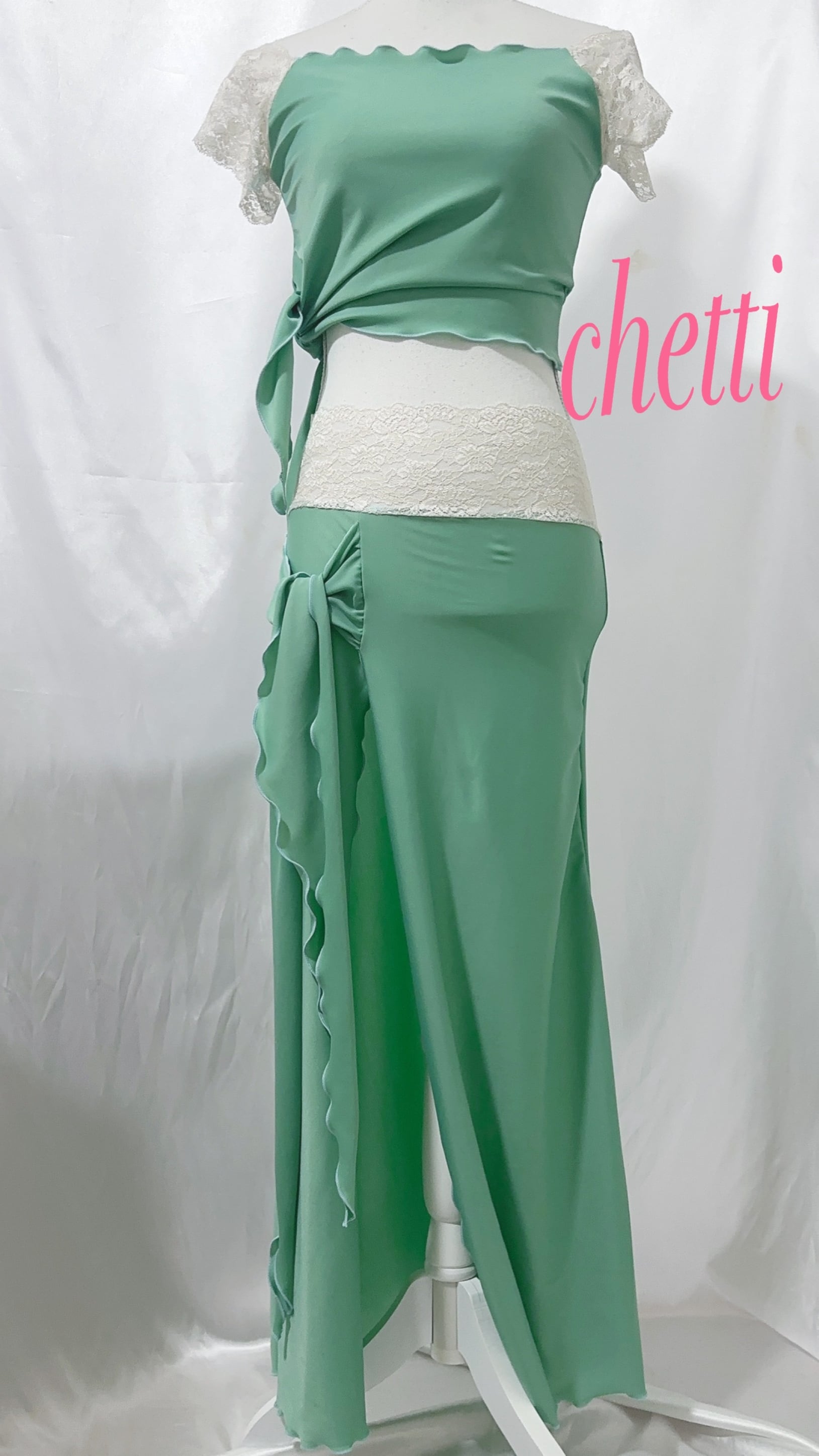 美しいグリーンとオフホワイトのレースが魅惑的に組み合わさったオフショルダーのセットアップです!女性らしいラインを引き立て、ダンスのパフォーマンスをより華やかに演出します。